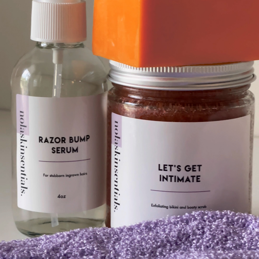 Using your Body Buff Gloves, lather up + cleanse with your Passion Fruit Soap. Follow with Let’s Get Intimate Body Scrub. After drying, apply Razor Bump Serum to freshly shaved areas.